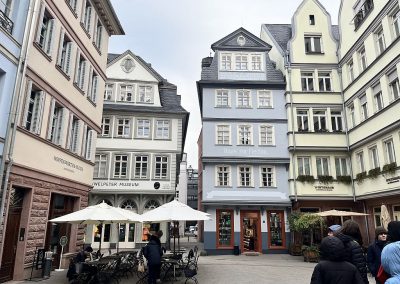 Am Vormittag stand für den Geographie-Kurs eine Führung zum Thema „Wirtschaftsstandort Frankfurt“ auf dem Programm. An vielen Stationen erleben wir von den Anfängen der ersten Bank und Messe bis hin zu den modernen Hochhäusern der Großbanken die wirtschaftliche Entwicklung der Stadt. Auch typische stadtgeographische Aspekte wie die Entwicklung von einer autogerechten Stadt hin zu kurzen Wegen und mehr Grünflächen können wir in der Realität beobachten. Auch die Messe Frankfurt spielt eine entscheidende Rolle für die Wirtschaft der Stadt. Messen bringen Gäste aus aller Welt in die Stadt und sichern Arbeitsplätze im Hotel- und Dienstleistungssektor. Uns wurde klar: Frankfurt ist nicht nur Bankenstadt, sondern ein global vernetzter Wirtschaftsstandort. Interessanter Nebenaspekt für uns Geographen: Seit die historische Altstadt rund um den Römer wieder eröffnet wurde (erst 2018!) hat sich die Übernachtungsdauer in Frankfurt deutlich erhöht.