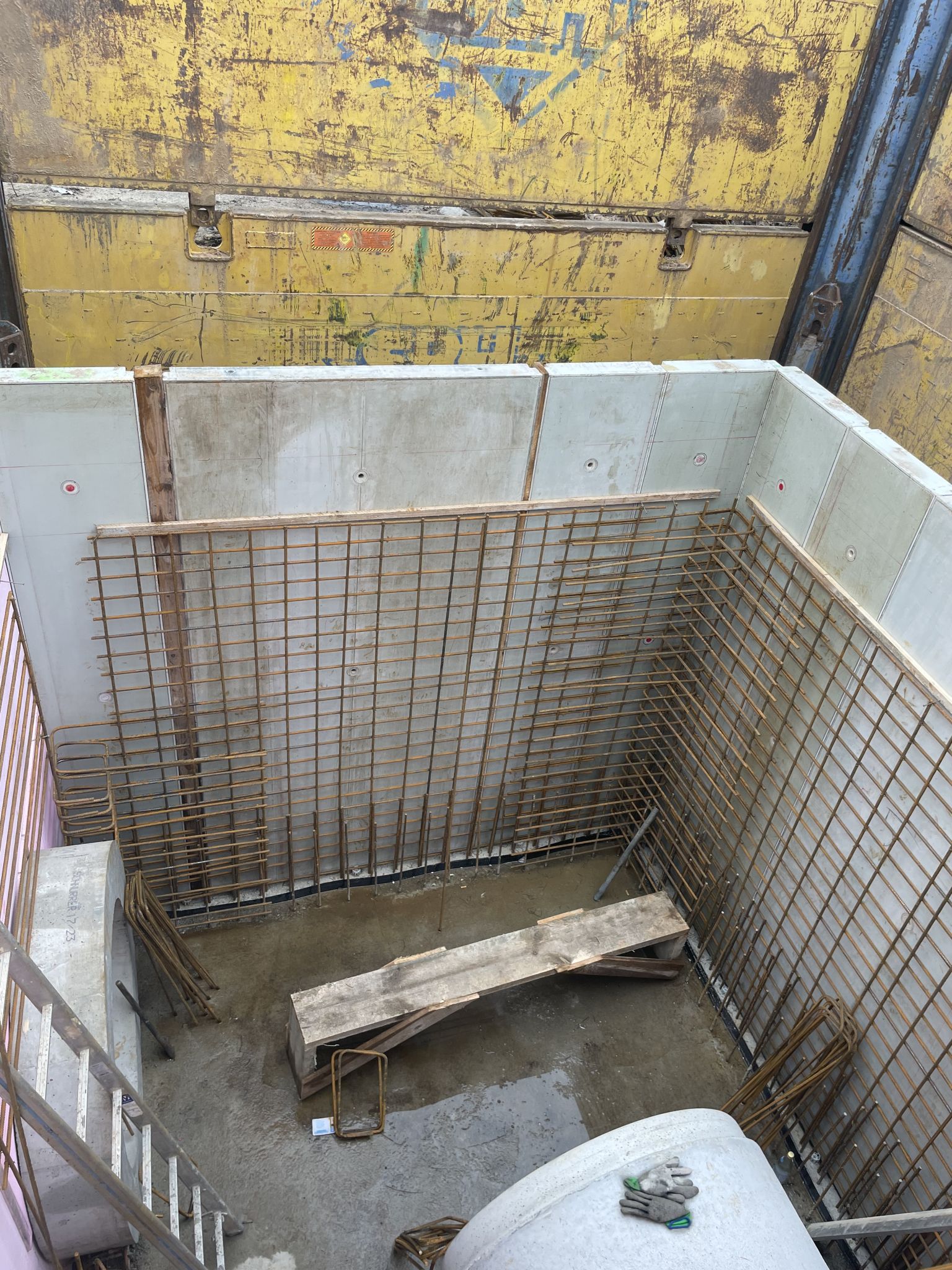 Auf der Baustelle ist kürzlich eine sog. Lastabtragungsplatte für einen bestehenden Mischwasserkanal fertiggestellt worden, der nahe der westlichen Grundstücksgrenze verläuft (im Bereich des früheren Basketball-Pausenhofs). Nachdem auf beiden Seiten des Kanals zunächst Bohrpfähle platziert worden waren, wurde zuletzt auf einer größeren Länge die Lastabtragungsplatte betoniert. Darüber wird später ein Teil des Fundament des Schulhauses liegen, das an dieser Stelle nicht unterkellert ist.