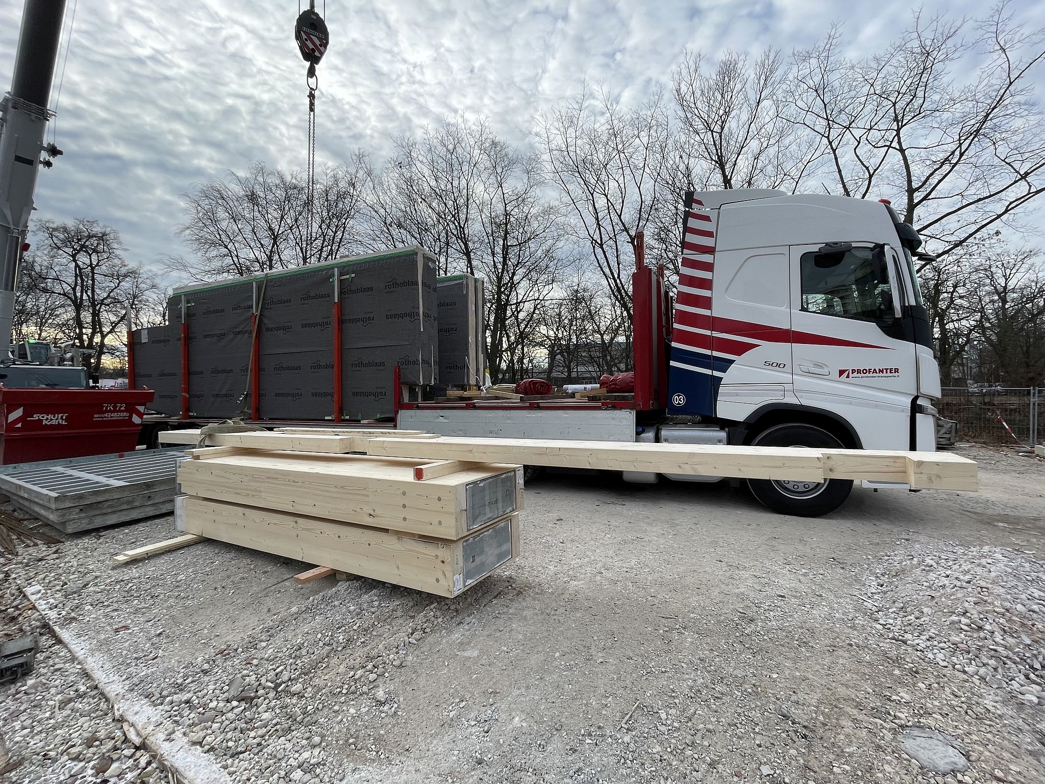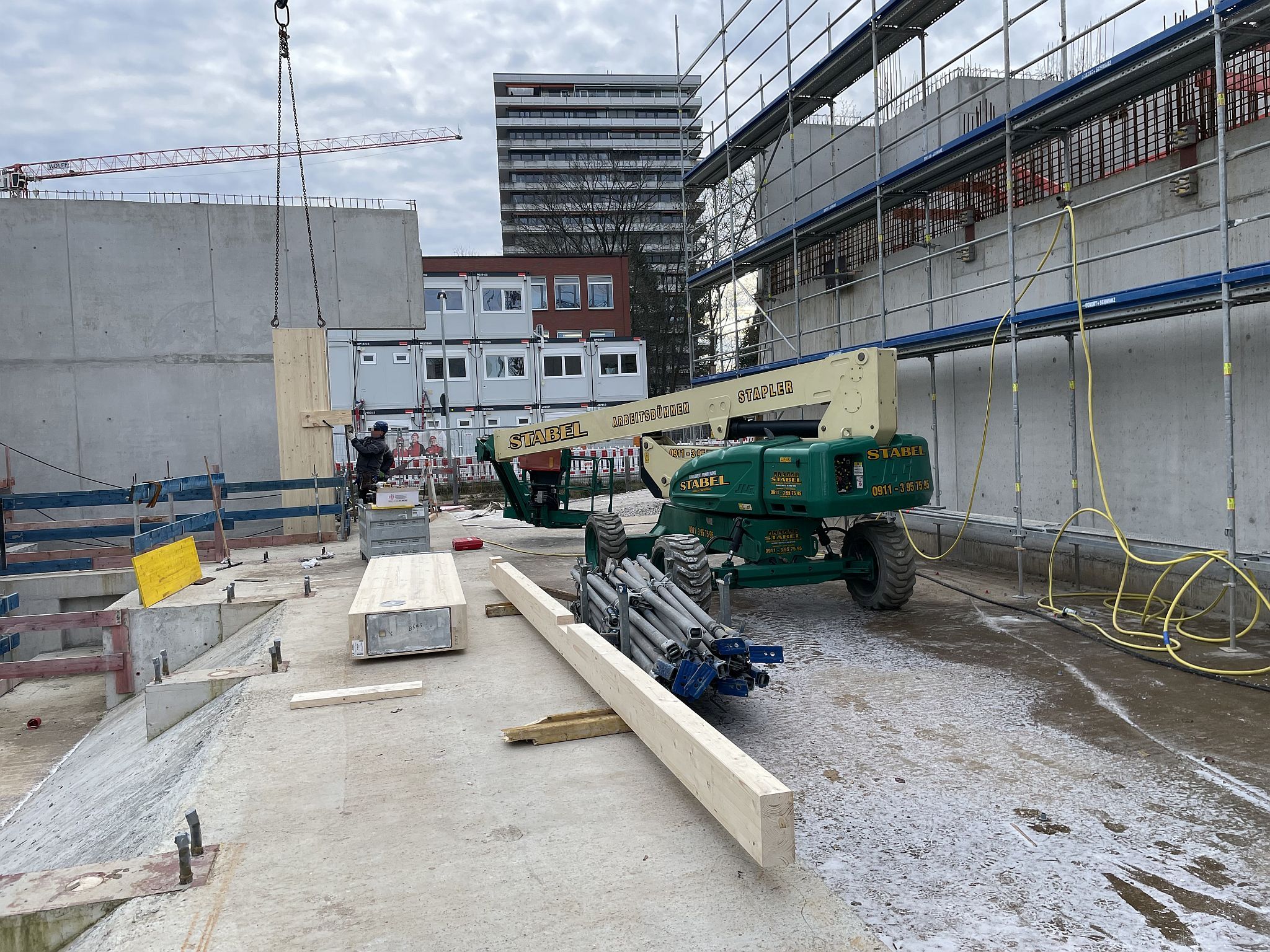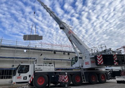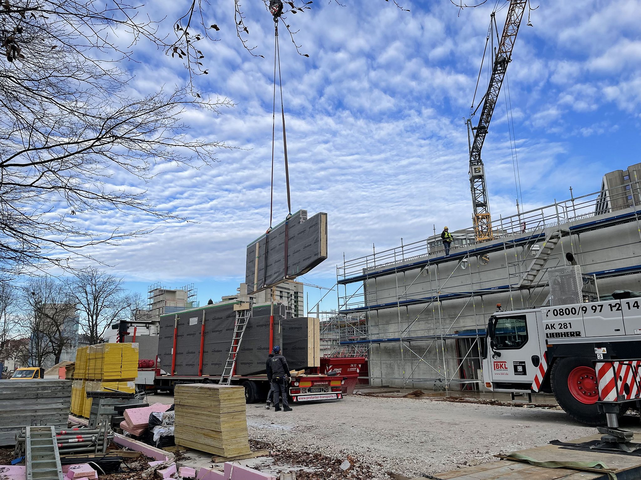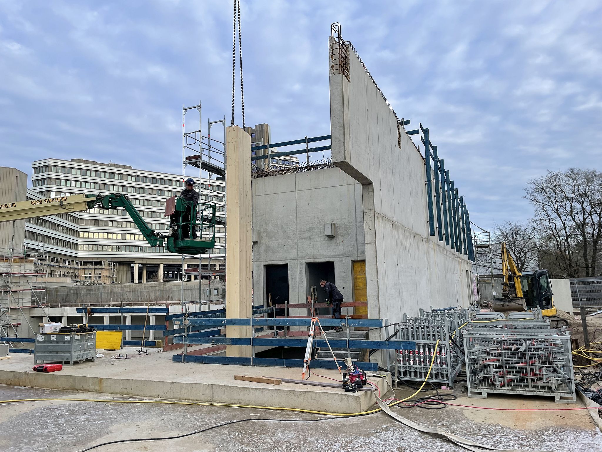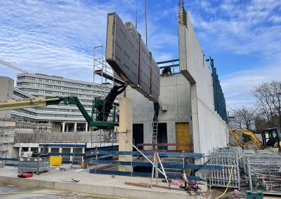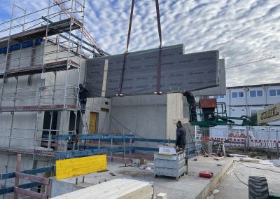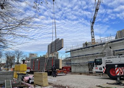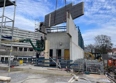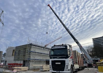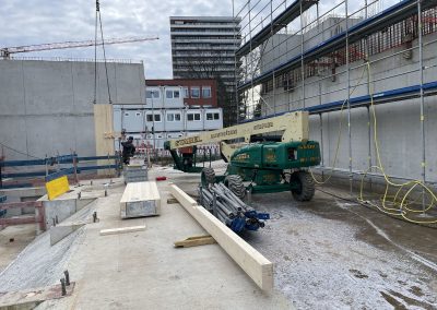 Mitte Januar sind die kurzen Holzbinder für die Sporthalle per Tieflader auf die Baustelle geliefert worden. Auch wenn nur wenige Meter lang, so sind sie doch tonnenschwer und wurden mit einem Kran über die künftige Mensa befördert und dann in Millimeterarbeit – dirigiert über Funk – an die vorgesehenen Stellen gesetzt. Nach der Montage der Holzbinder wird die Rohbaufirma die Decke über den Nebenräumen der Sporthalle betonieren.