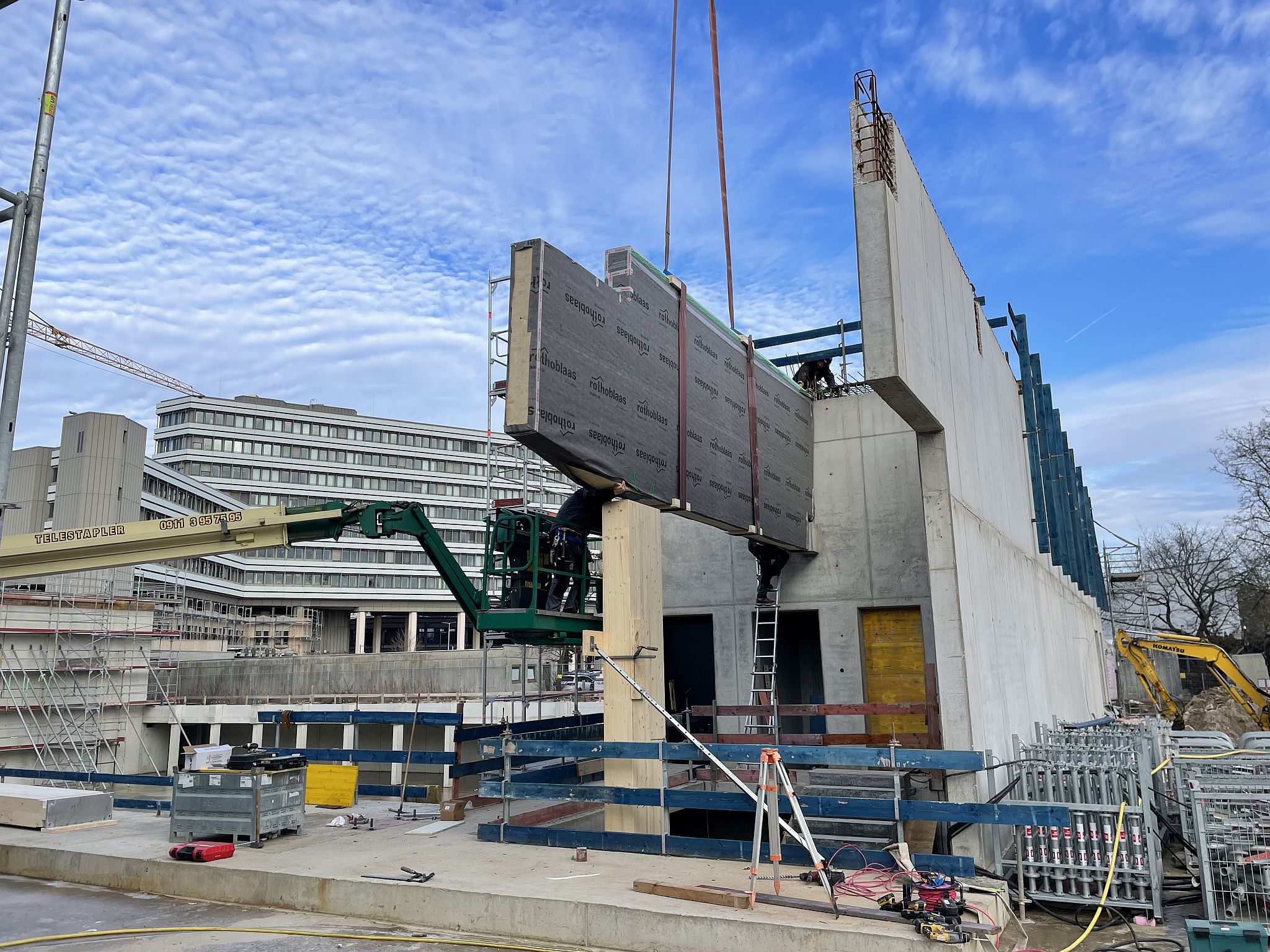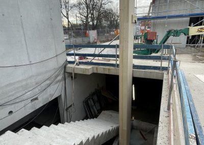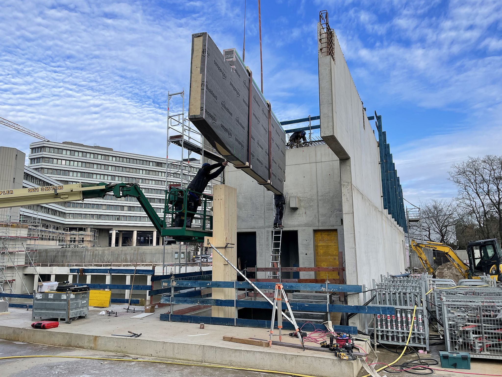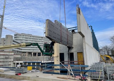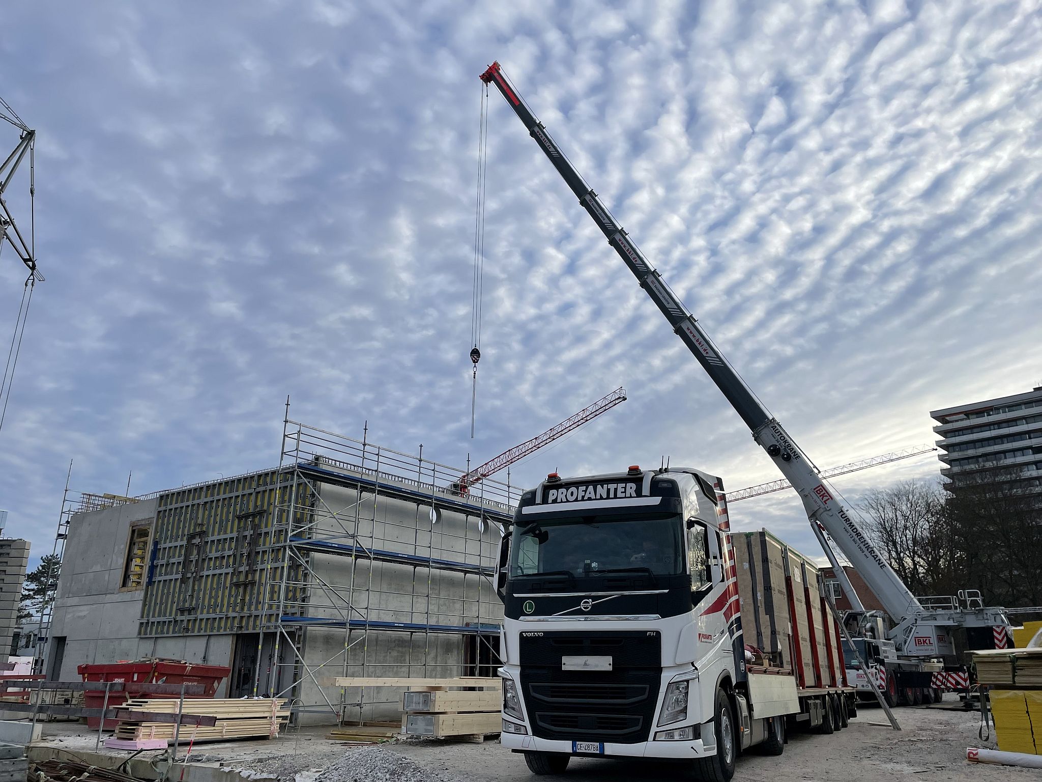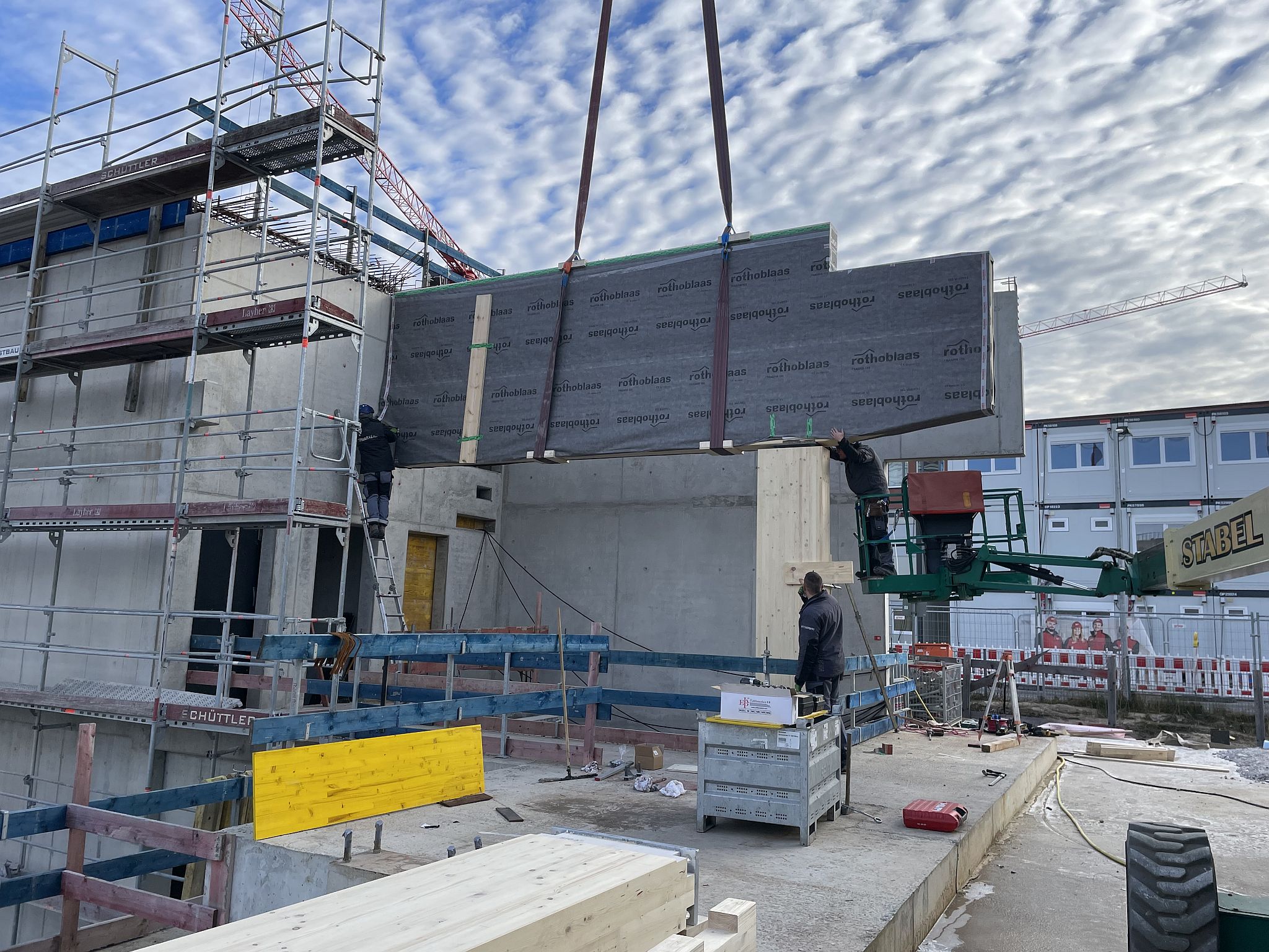 Mitte Januar sind die kurzen Holzbinder für die Sporthalle per Tieflader auf die Baustelle geliefert worden. Auch wenn nur wenige Meter lang, so sind sie doch tonnenschwer und wurden mit einem Kran über die künftige Mensa befördert und dann in Millimeterarbeit – dirigiert über Funk – an die vorgesehenen Stellen gesetzt. Nach der Montage der Holzbinder wird die Rohbaufirma die Decke über den Nebenräumen der Sporthalle betonieren.