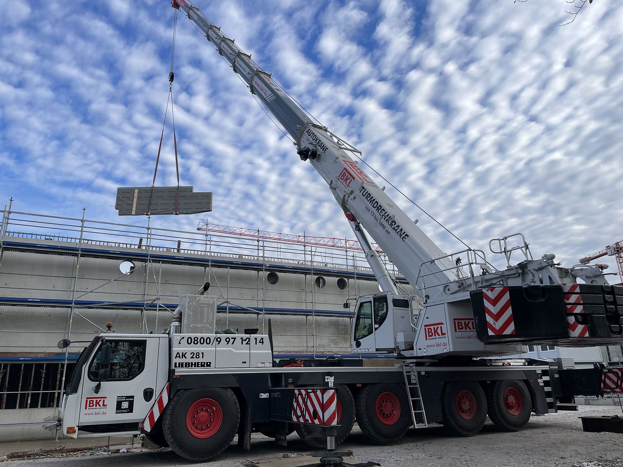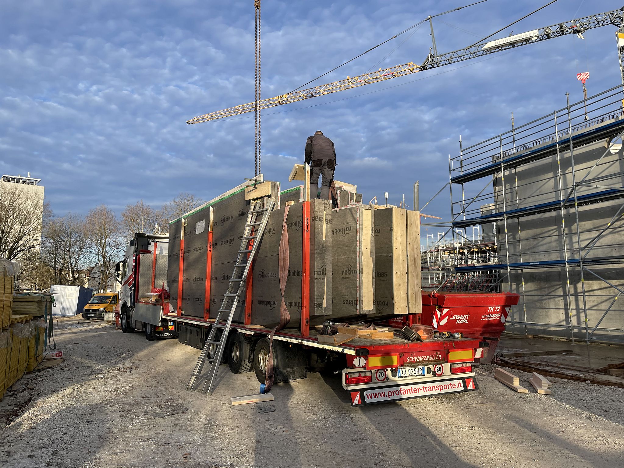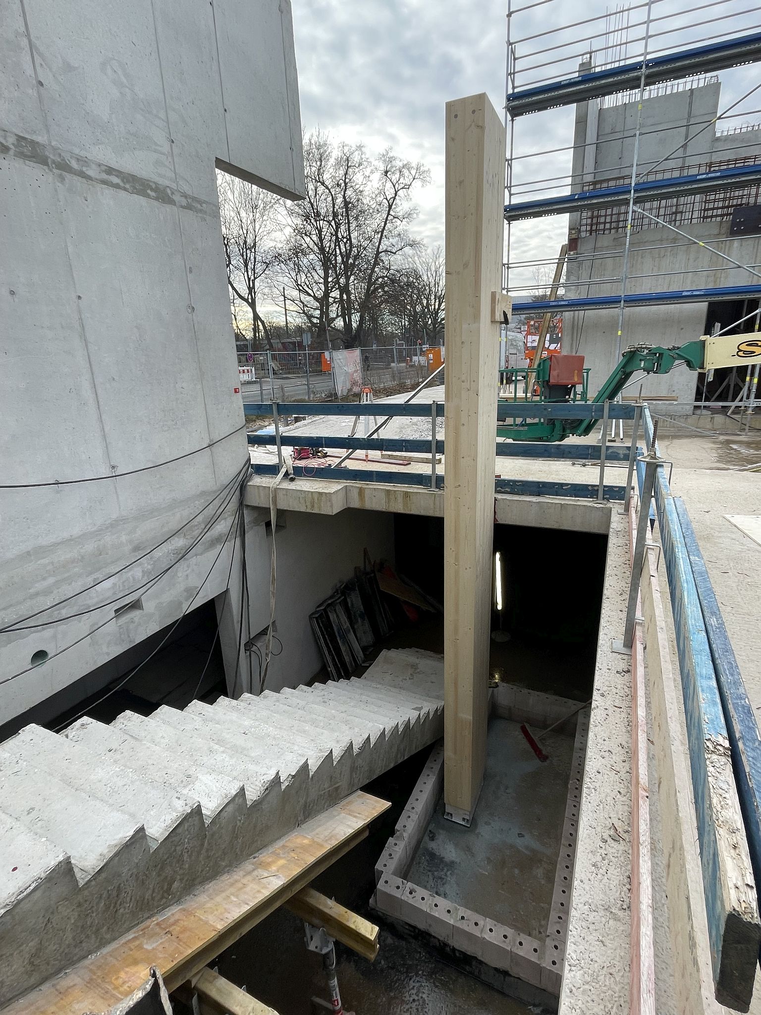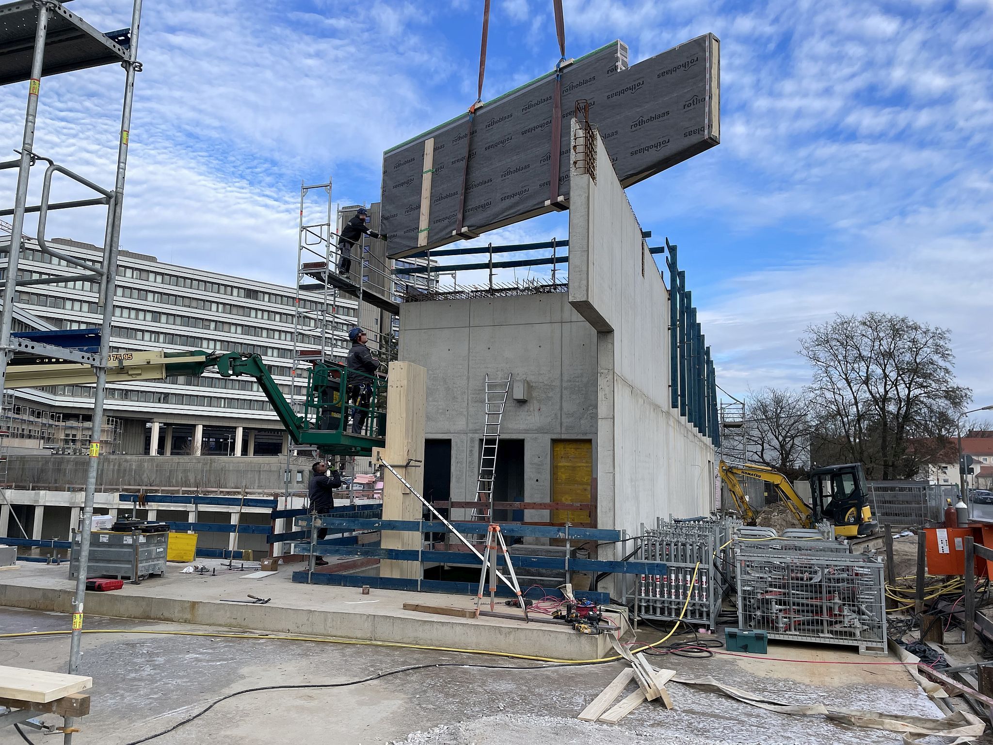 Mitte Januar sind die kurzen Holzbinder für die Sporthalle per Tieflader auf die Baustelle geliefert worden. Auch wenn nur wenige Meter lang, so sind sie doch tonnenschwer und wurden mit einem Kran über die künftige Mensa befördert und dann in Millimeterarbeit – dirigiert über Funk – an die vorgesehenen Stellen gesetzt. Nach der Montage der Holzbinder wird die Rohbaufirma die Decke über den Nebenräumen der Sporthalle betonieren.