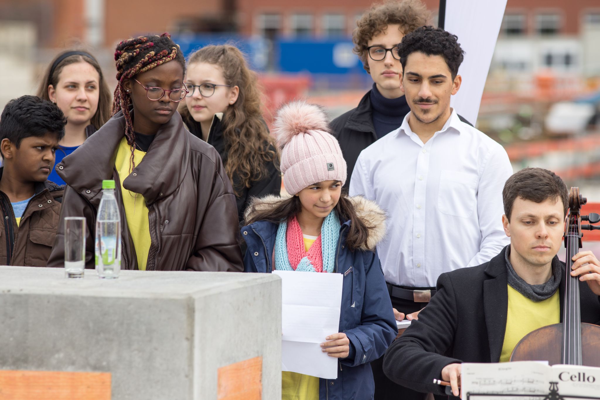 Das Verschließen der Zeitkapsel übernahmen spontan ebenfalls Zeki und Tyrell, bevor die Wünsche für das neue Schulhaus vorgetragen und jeweils durch drei Hammerschläge bekräftigt wurden. Eingestimmt durch ein von den Lehrkräften Simon Kreß und Markus Böhm gespielten Musikstücks sprachen Schülerinnen und Schüler verschiedener Religionsgemeinschaften Segenswünsche. So wie die Grundsteinlegung begonnen hatte, endete sie schließlich auch: die MBG-Bigband sorgte für eine gelungene musikalische Untermalung.