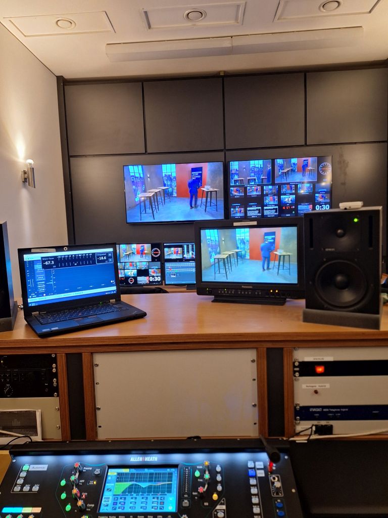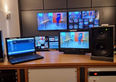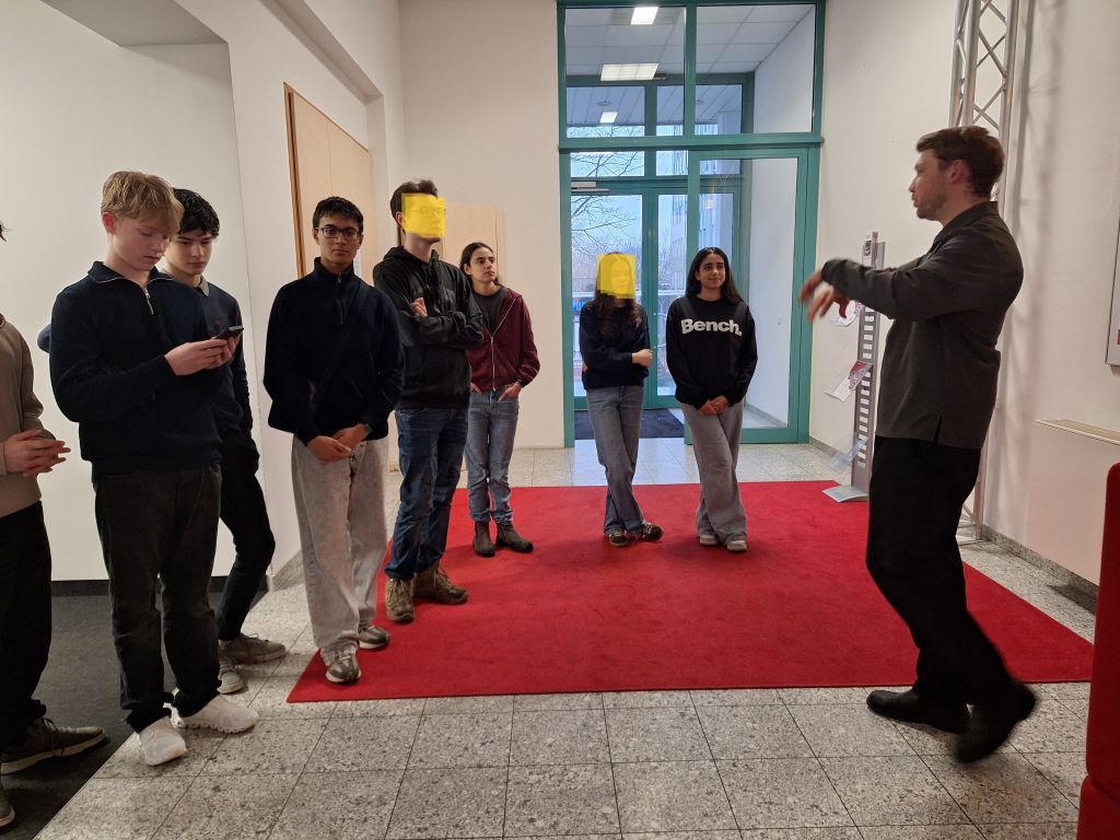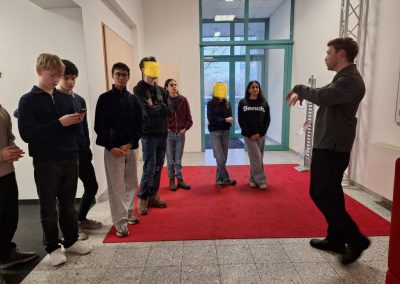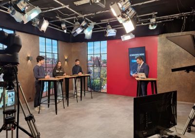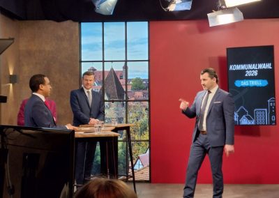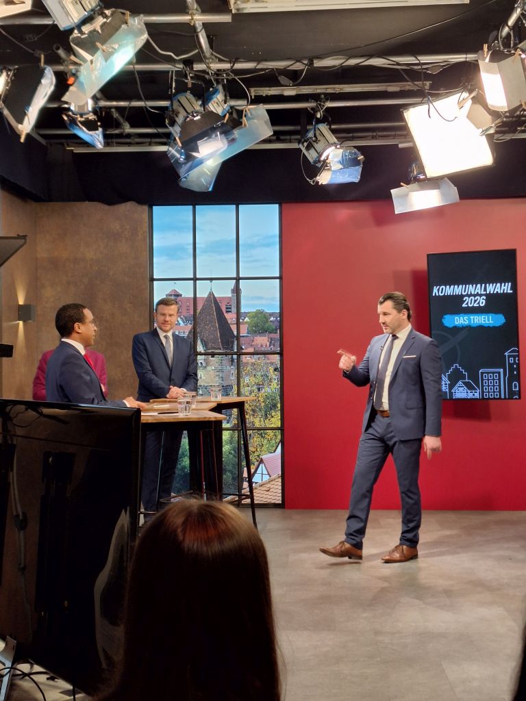 Nach einer kurzen Führung durch die Räumlichkeiten des Senders mit der Redaktion, Schnittplätzen, Sprecherkabine, Regie und Sendeabwicklung (- danke an Herrn Roser!) wurden die Plätze im Studio eingenommen. Da die Diskussionsgäste noch nicht angekommen waren, durften drei Behaimer spontan für eine letzte Probe die Plätze der drei Talkgäste einnehmen. Die folgenden 60 Minuten des Triells vergingen im Nu, so dicht gefüllt war der Fragenkatalog des Moderators und Studioleiters von Franken Fernsehen, Philipp Waldmann. Inhaltlich diskutierten die Kontrahenten verschiedene Themen, die für die Nürnbergerinnen und Nürnberger im Alltag wichtig sind wie z.B. die Gestaltung der Innenstadt oder eine gelungene Regulierung des zunehmenden Verkehrs. Auch um Bildung ging es im Verlauf der Debatte – und in diesem Zusammenhang sogar um den Neubau des MBG. Auch wenn es an der ein oder anderen Stelle durchaus etwas hitzig wurde – die Schülerinnen und Schüler attestierten den Politikern im Anschluss ein sehr faires Diskussionsverhalten und erwarten nun gespannt den Ausgang der Kommunalwahlen am 08. März.